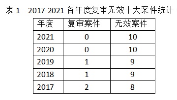 從復(fù)審關(guān)注度看,我們注意到近5年國(guó)家知識(shí)產(chǎn)權(quán)局發(fā)布的各年度專利復(fù)審無(wú)效十大案件,統(tǒng)計(jì)結(jié)果如表1所示。從整體上看復(fù)審案件的占比較少,特別是近兩年的復(fù)審案件均為0件,表明復(fù)審案件低于無(wú)效案件的關(guān)注度,也表明近兩年復(fù)審案件中出現(xiàn)的典型案例和指引較少。“2021年,共受理專利無(wú)效宣告請(qǐng)求7628件”,這與專利復(fù)審請(qǐng)求7.6萬(wàn)件相比,在數(shù)量對(duì)比上僅為復(fù)審案件的十分之一。因此,專利復(fù)審仍然是專利復(fù)審和無(wú)效審理部的主要工作。